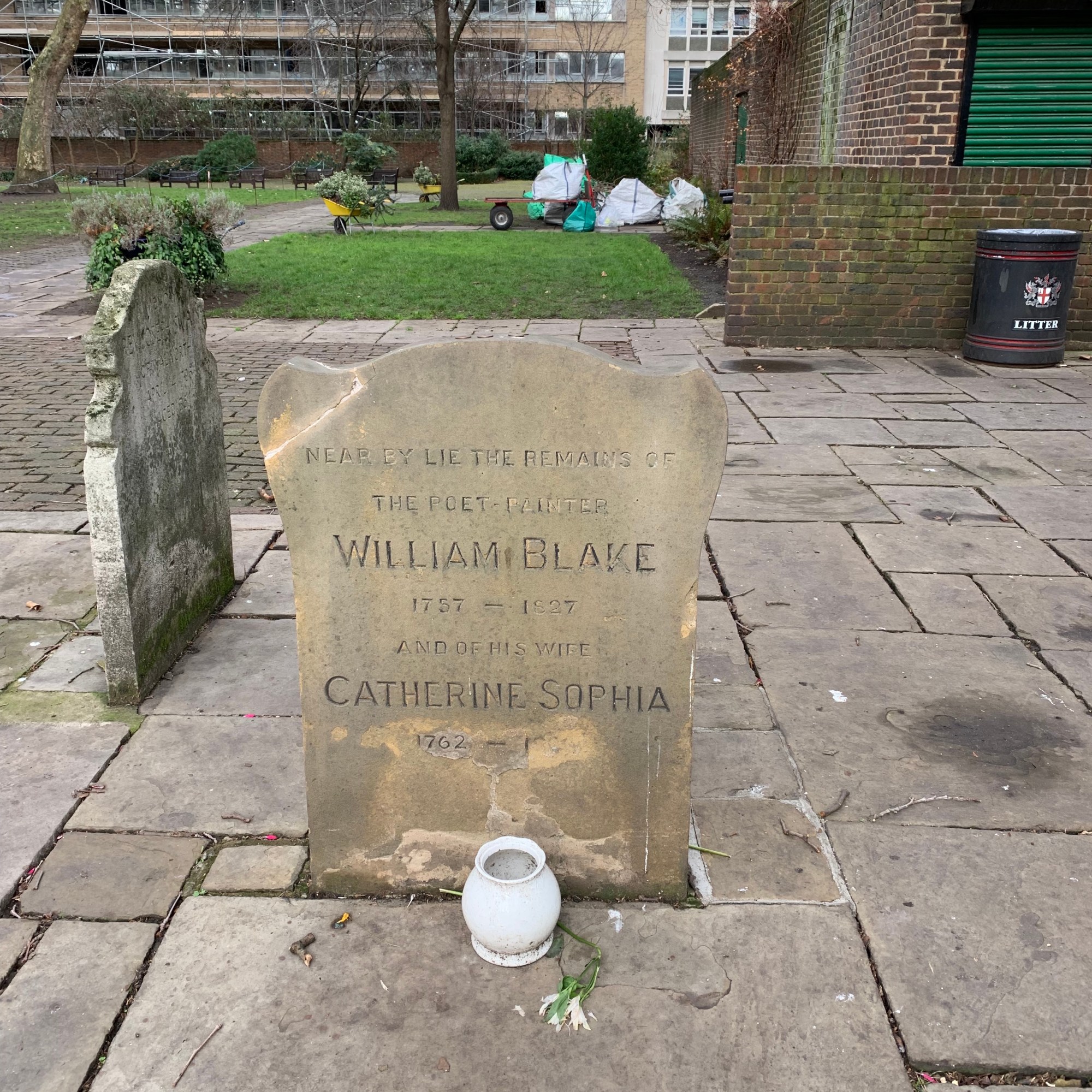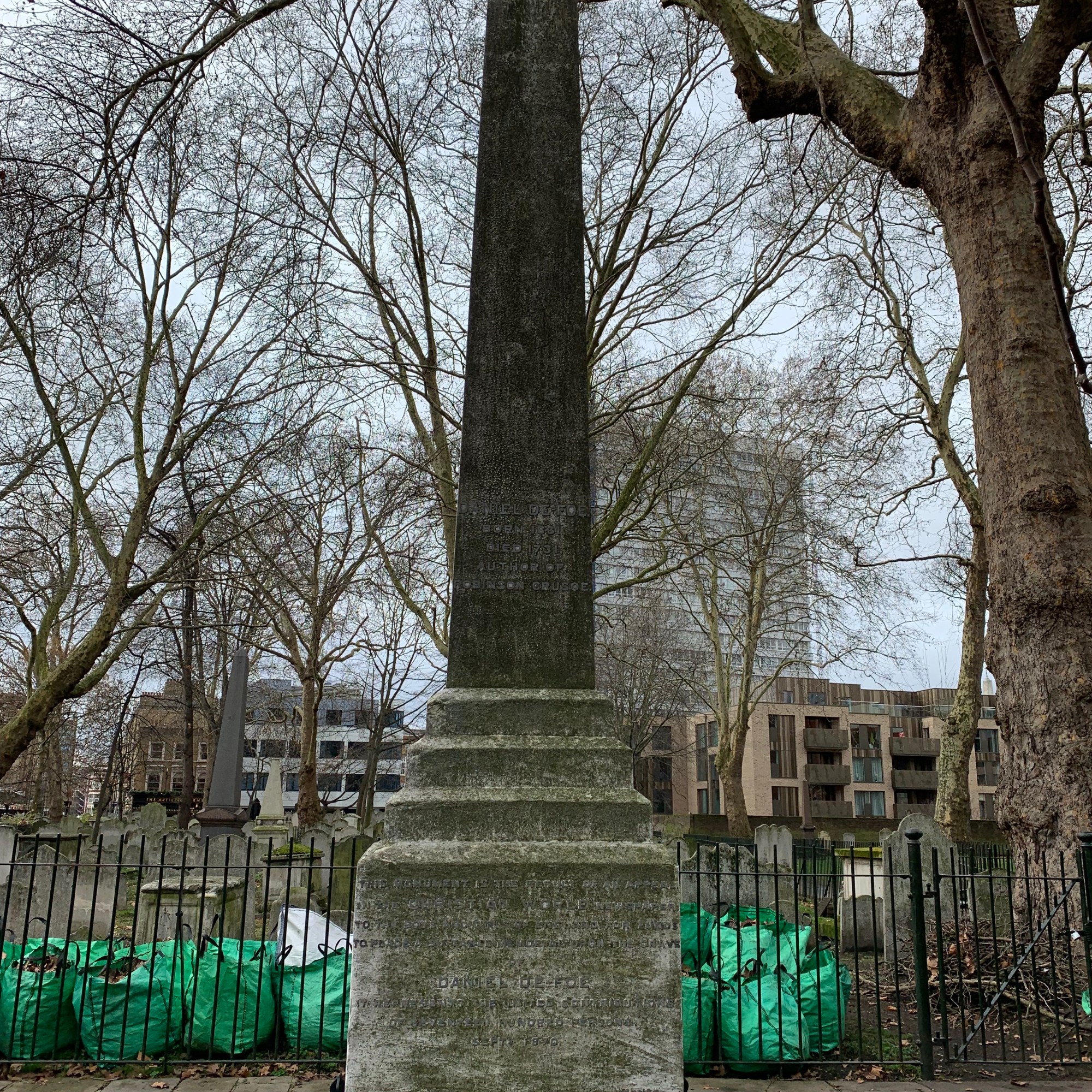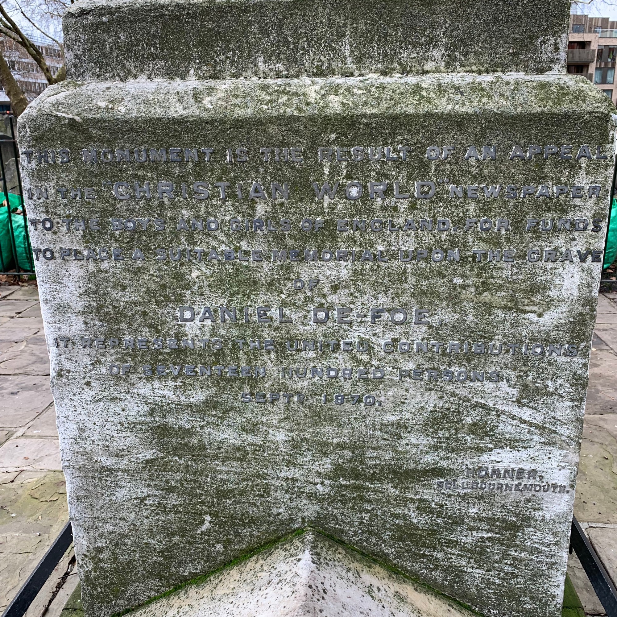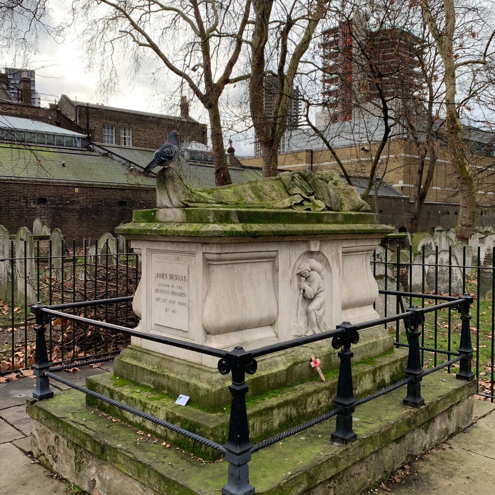 I got on the underground, headed for Bunhill Fields Cemetery. I thought it might be similar to Highgate, but I was sadly mistaken. This cemetery wasn’t nearly as cared for, nor did it appear to garner as much interest nor was it as open as Highgate. There were 3 grave markers outside of the locked gates – one for John Bunyan (of particular interest to me, as he wrote Pilgrim’s Progress, which he famously wrote whilst imprisoned… in Bedford Prison next to where I went to school for 9 years), one for the poet, William Blake, and one for Daniel Defoe, who wrote Robinson Crusoe.